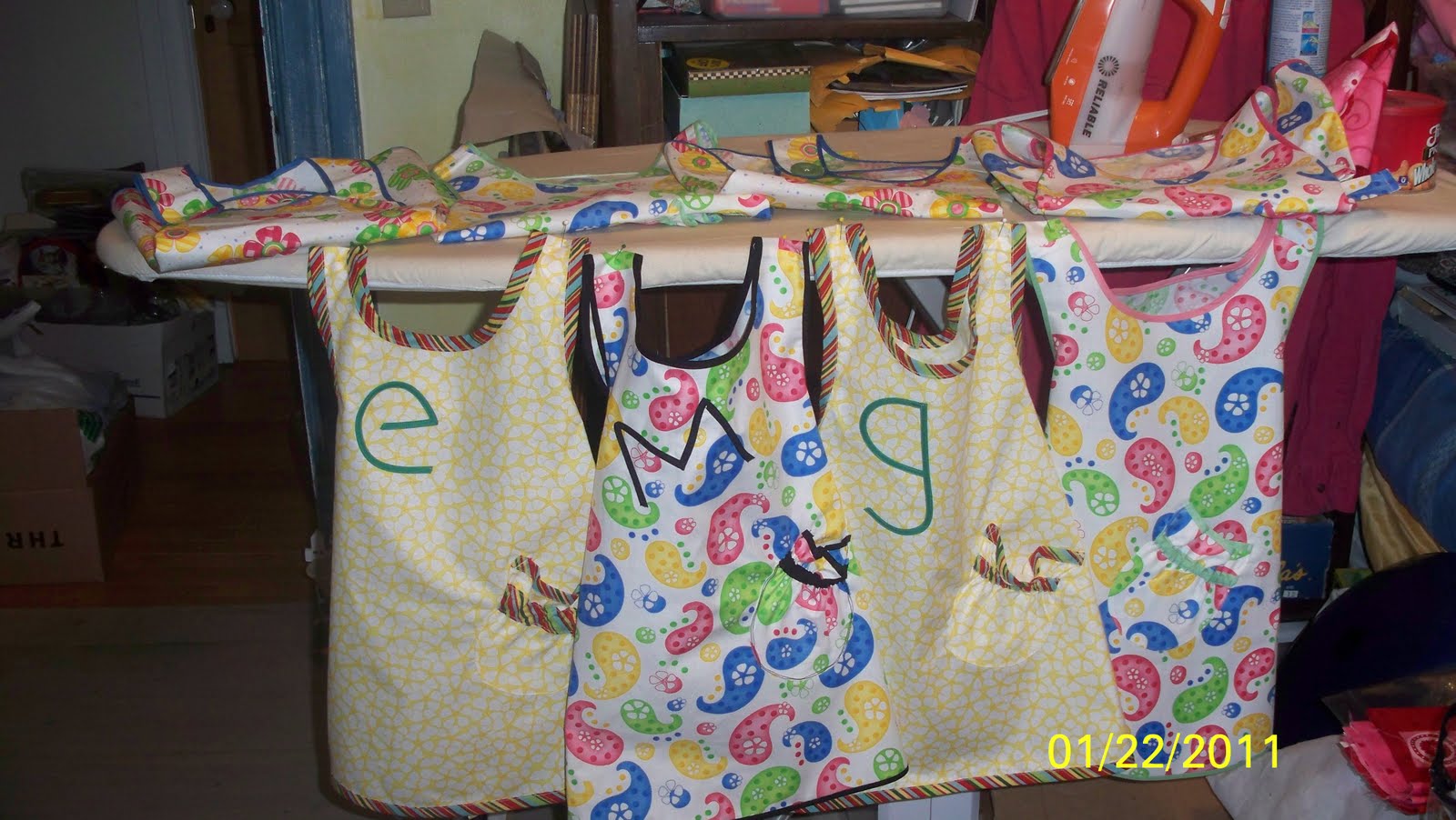 I have 8 little girls birthdays to think about this year and so I took an idea from Jerilu and made aprons. Here are 7 of them and one was sent off last week. Really fun to make and turned out cute!I decided to make them all at once so I wouldn't be doing them the night before their birthdays like I usually do. I'll add some cooking utensils and a package of cookie mix or something and voila I'm done!